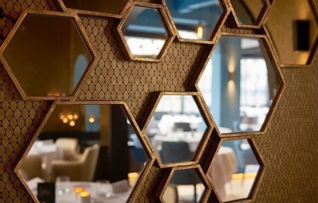 Elke ruimte kreeg haar eigen signatuur waarbij een harmonieuze eenheid bewaard bleef door het gebruik van subtiele verbindende factoren. Bijvoorbeeld de honingraat-vorm die terugkomt in de stoffering van de stoelen, de verlichting en de decoratieve spiegel in de nis en in de messing deuren van de wijnkasten.