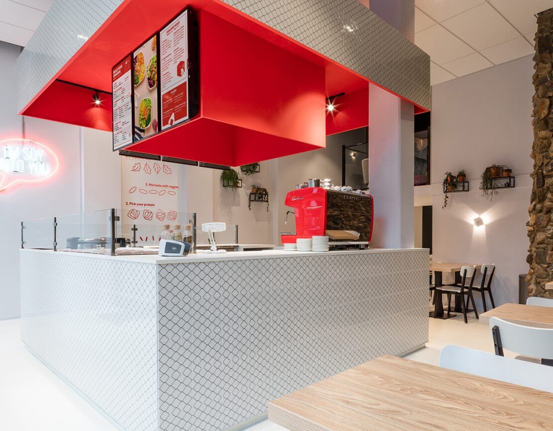 Sfeer speelt een belangrijke rol in de inrichting van The Poké Box. De nieuwe healthy hotspot moest een fijne plek worden waar je niet alleen een maaltijd afhaalt, maar waar je ook wat langer kunt blijven chillen. Bijvoorbeeld in de lounge boven of aan de bar bij het raam. The Poké Box heeft een moderne, toegankelijke en gezellige uitstraling gekregen waarin de frisse, rode huiskleur voor een stoer accent zorgt.